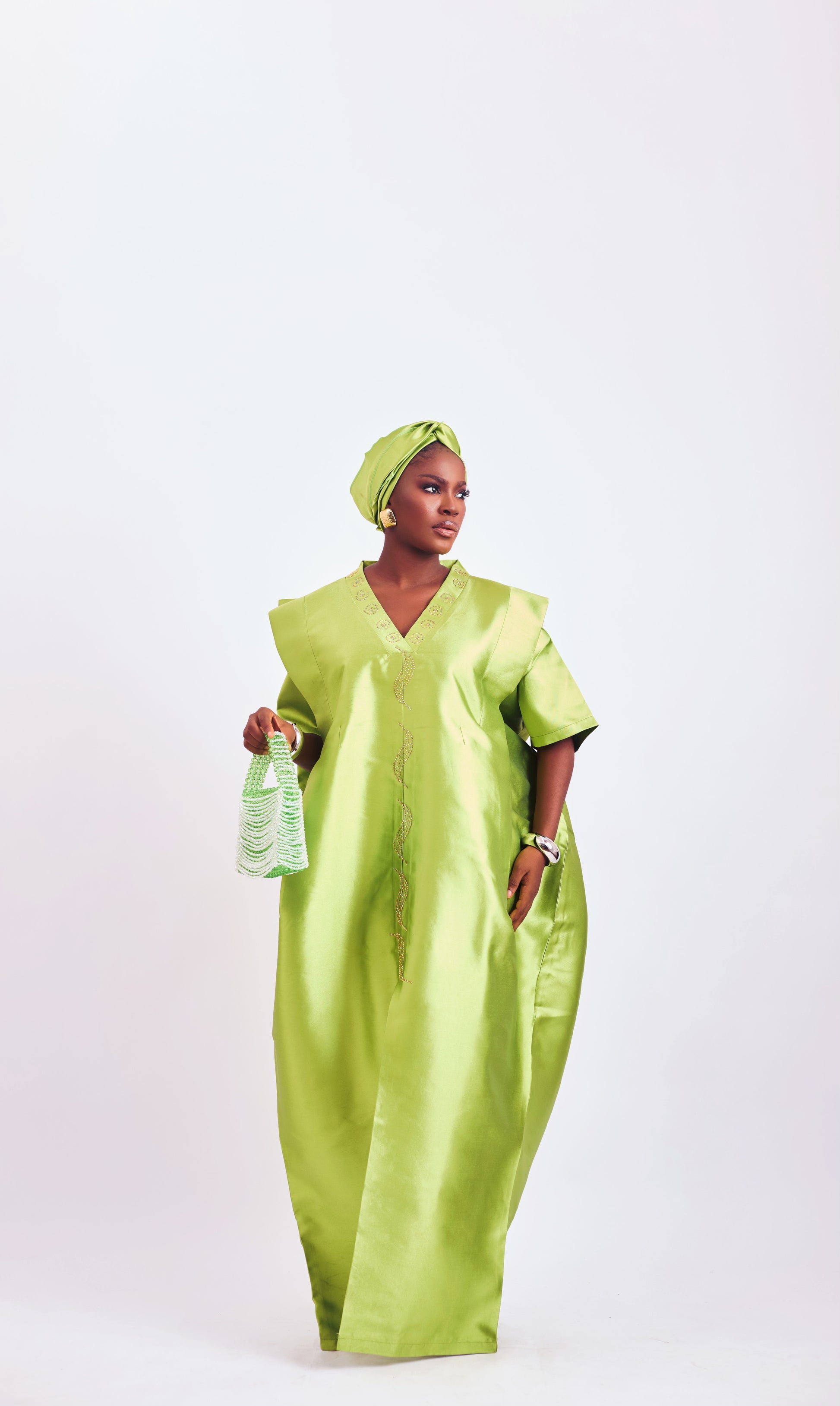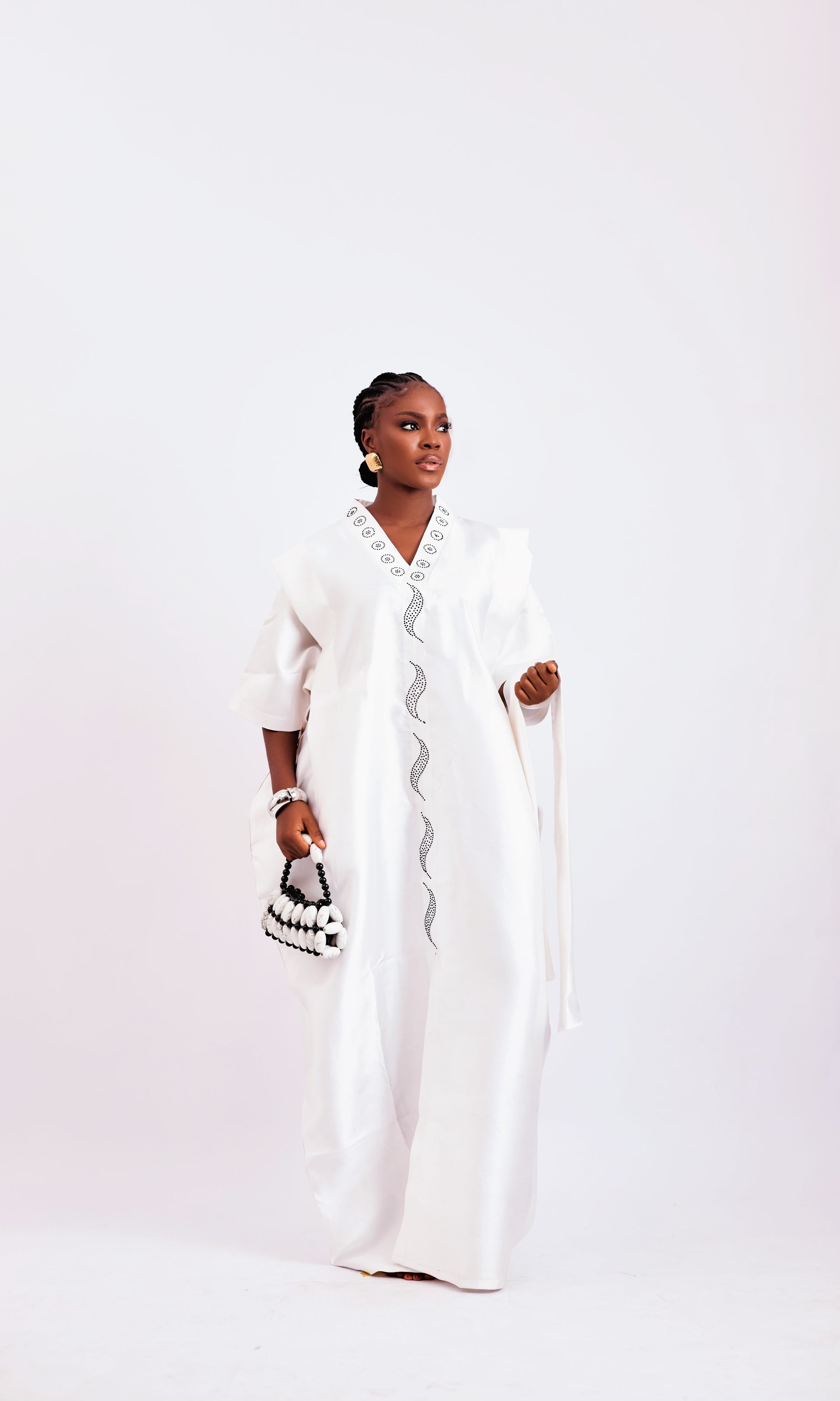 Introducing our exquisite one-size-fits-all kaftan-style dress, where comfort meets luxury in perfect harmony. Crafted from the finest Mikado, this dress exudes sophistication and style with its loose-fitted silhouette and elegant V-neck detail.